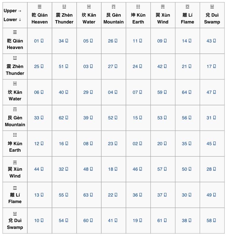 I Ging TABELLE / wikipedia | Prinz Mario Max zu Schaumburg Lippe I-Ging November 18, 2011November 18, 2011 I Ging Master Set TABELLE GROSS 3 Muezen – sechs Wuerfe von Unten nach Oben aufschreiben. 1 Anti Karma Muenze umhaengen. Share this: Click to share on Facebook (Opens in new window) Facebook Click to share on X (Opens in new window) X Like Loading...
