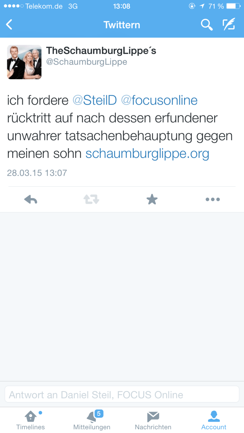 “Dieser respektlose Journalismus darf sich nicht in der deutschen Pressewelt etablieren. Ohne jegliche Kontaktaufnahme, meiner Familie zu schaden, akzeptiere ich keinenfalls! Ich fordere eine unmittelbare Entschuldigung von der Geschäftsführung und Richtigstellung!”, Schaumburg Lippe zu der Falschbehauptung auf Focus Online.